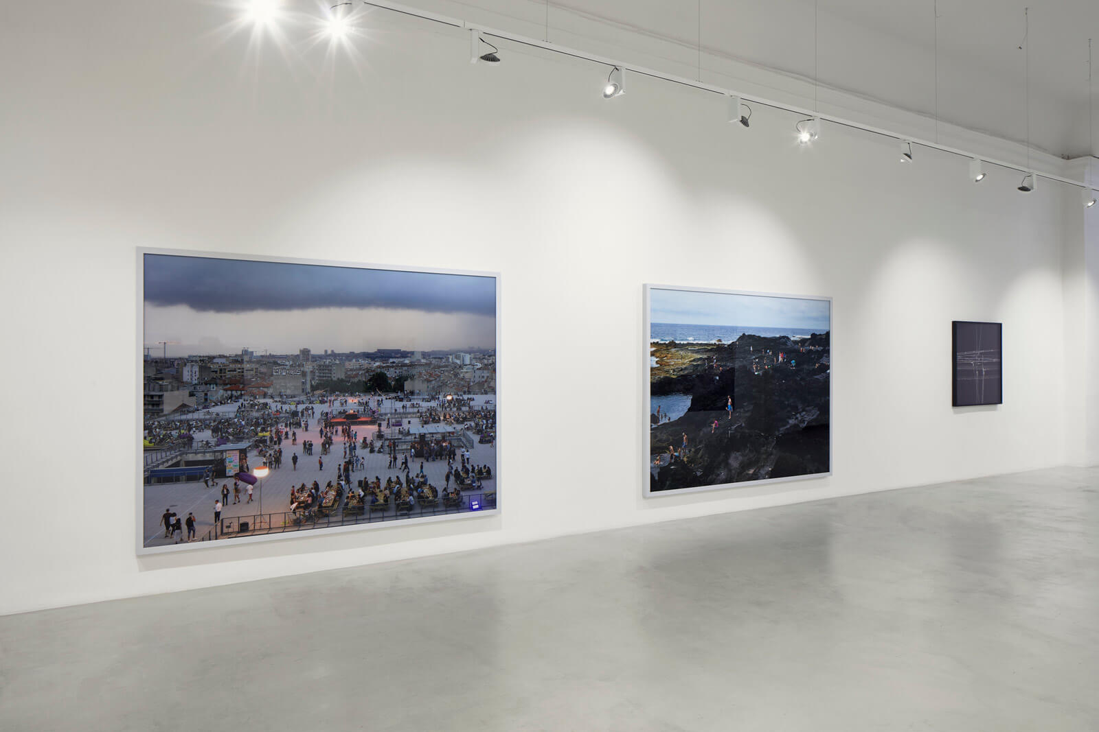 On display are two large photos with dark tones by Massimo Vitali, the first Ponta dos Mosteiros Dark (2018) was taken in the Azores Islands, an archipelago in the Atlantic with a temperate climate. On the peaks of the volcanoes it rains almost every day and on the beach it’s sunny almost every day. Here the light employed is natural. The rocky background of volcanic origin is so dark that the colors of the swimwear and objects stand out. Here everything is lava, everything is hard and sharp, and light changes very quickly.
